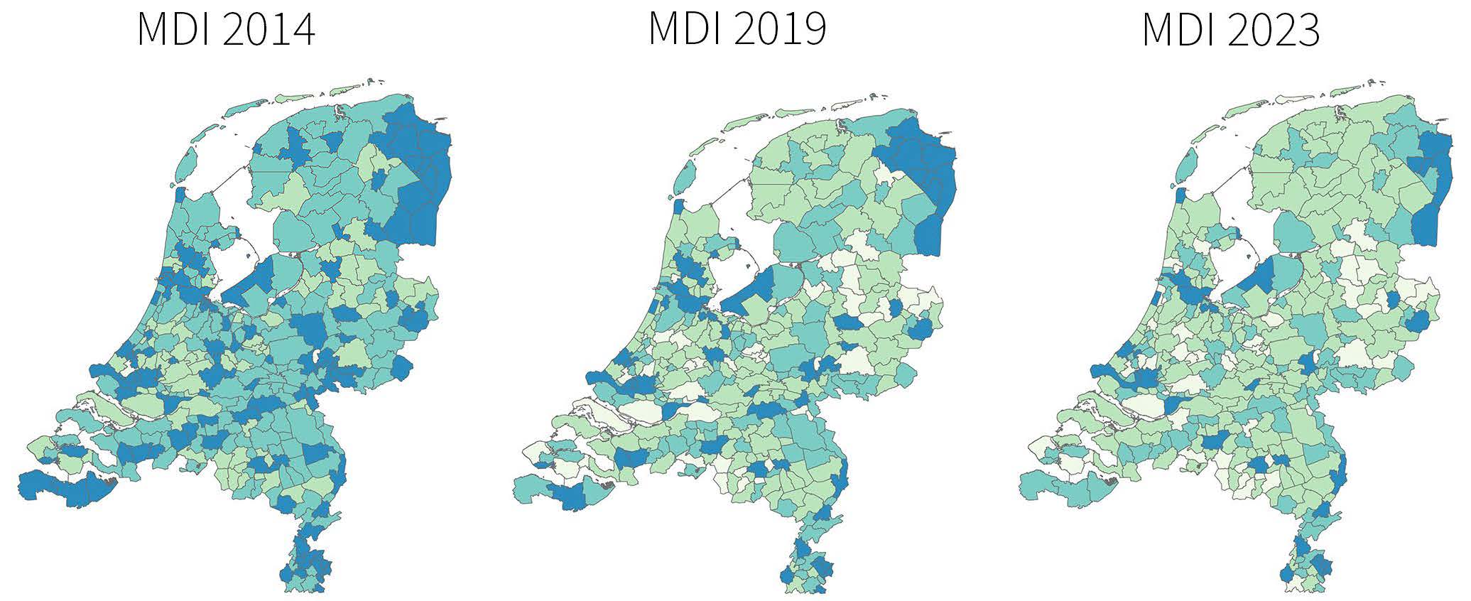 Uit het onderzoek blijkt dat er sprake is van een zogenaamde ‘achterstandsparadox’. Naast een landelijk stijging van het gemiddelde inkomen is opvallend dat ook het percentage arme huishoudens in de periode 2014-2023 is gegroeid. Niet iedereen profiteert van de positieve ontwikkeling in termen van verminderde deprivatie. Naast een aantal grote stedelijke gemeenten met een concentratie van achterstanden, zijn er ook meer perifeer gelegen regio’s die hoge tot zeer hoge MDI-scores kennen. Sterker nog, de perifere zone springt eruit als het gaat om de stapeling van achterstanden op regionaal niveau. In regio’s als Oost-Groningen, Delfzijl en omgeving, Zuid-Limburg, Zuidoost-Drenthe, Zeeuws-Vlaanderen, Overig Groningen, Midden-Limburg en Kop van Noord-Holland ligt het gemiddeld inkomen lager en het percentage arme huishoudens hoger dan landelijk gemiddeld.